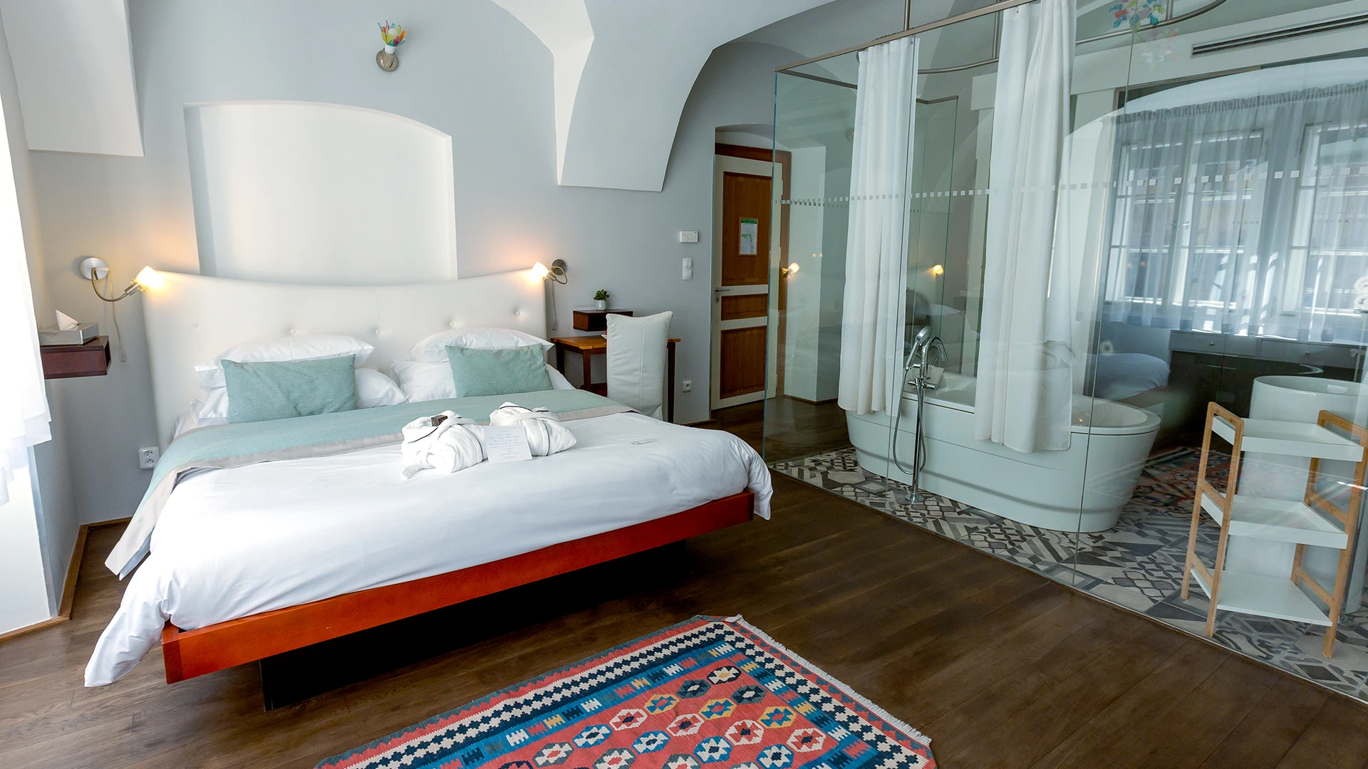 Prostorné klimatizované pokoje navržené Bořkem Šípkem nabízejí klidné a romantické útočiště.