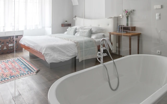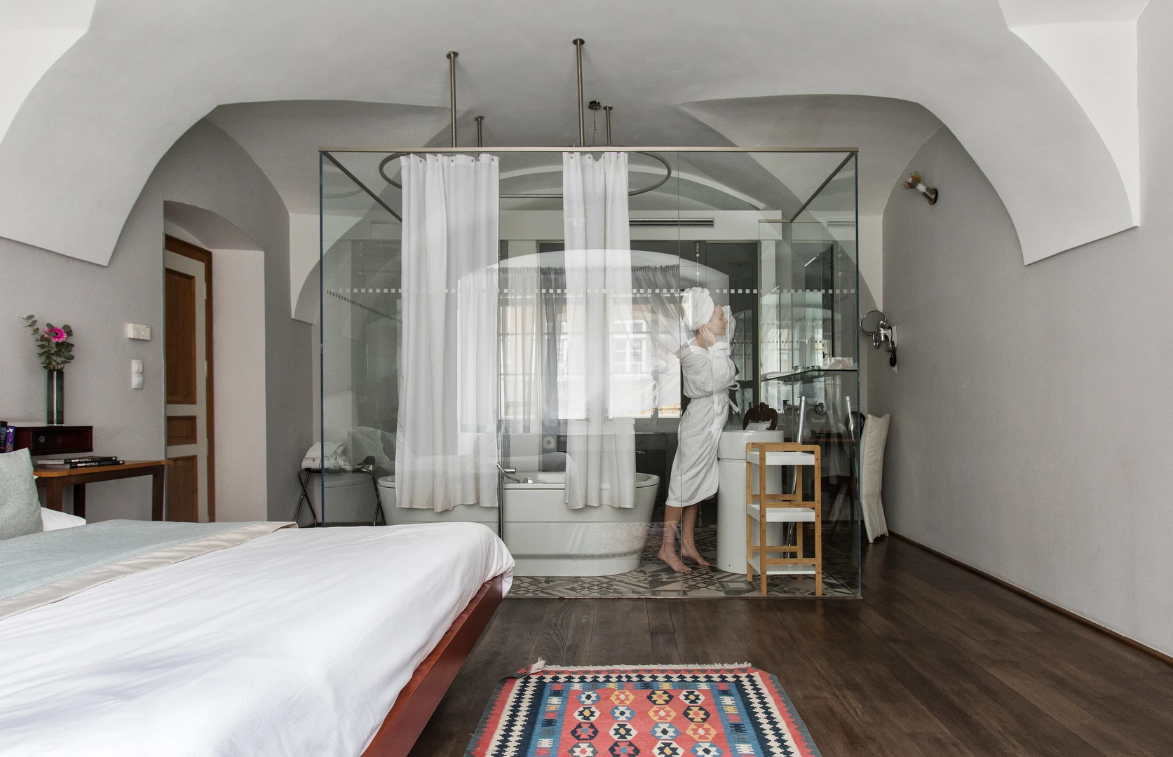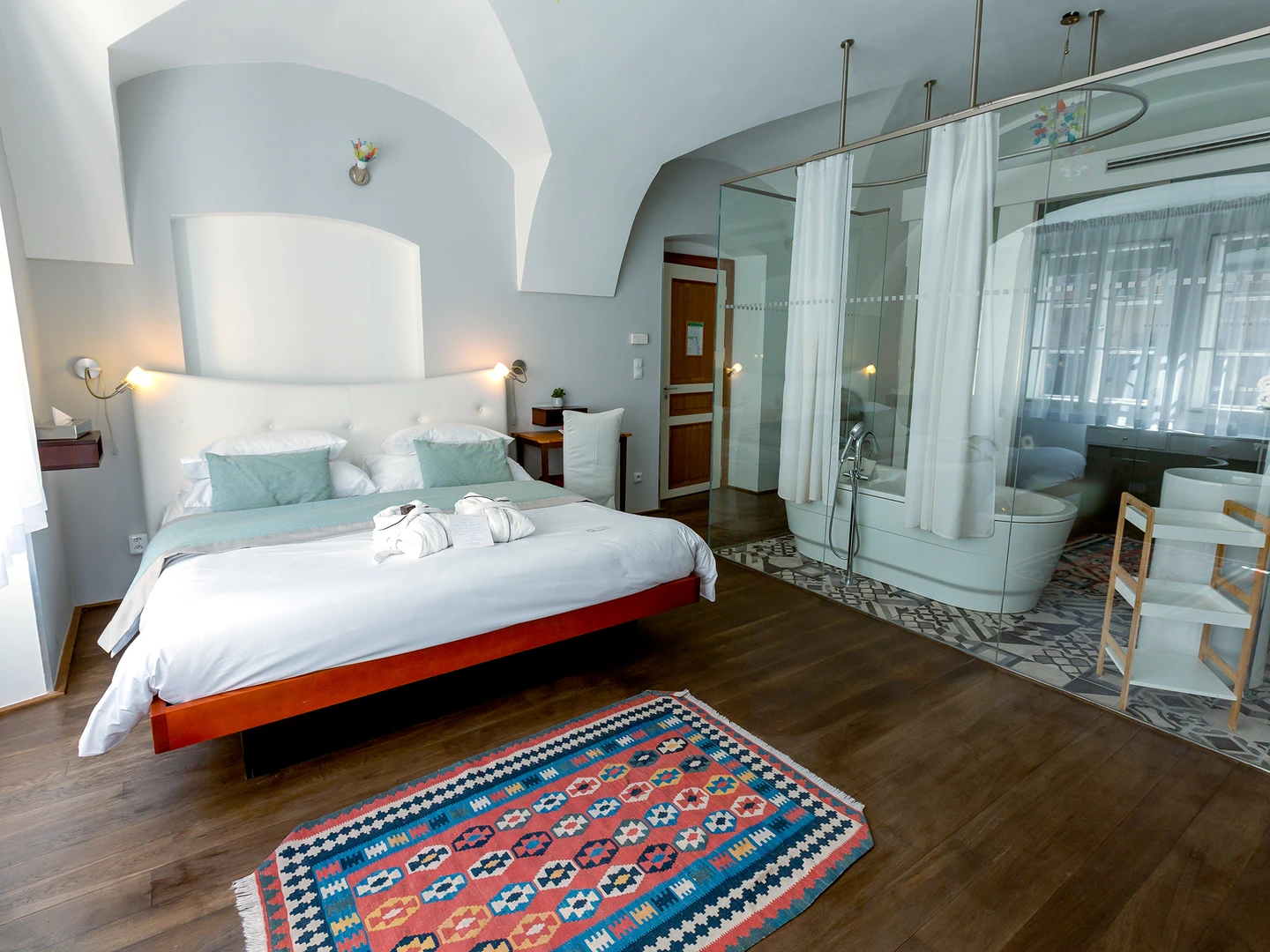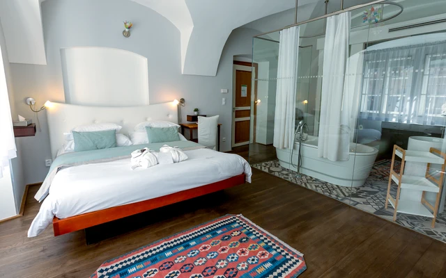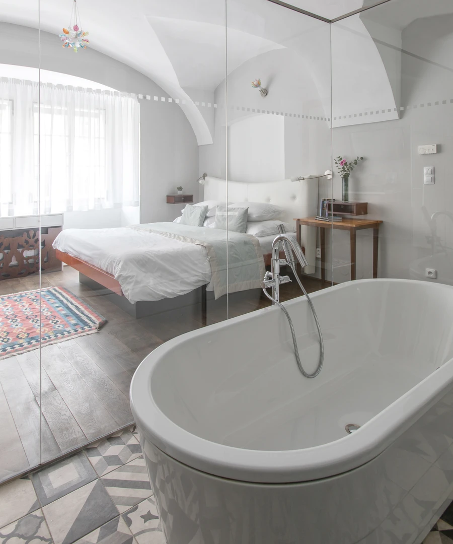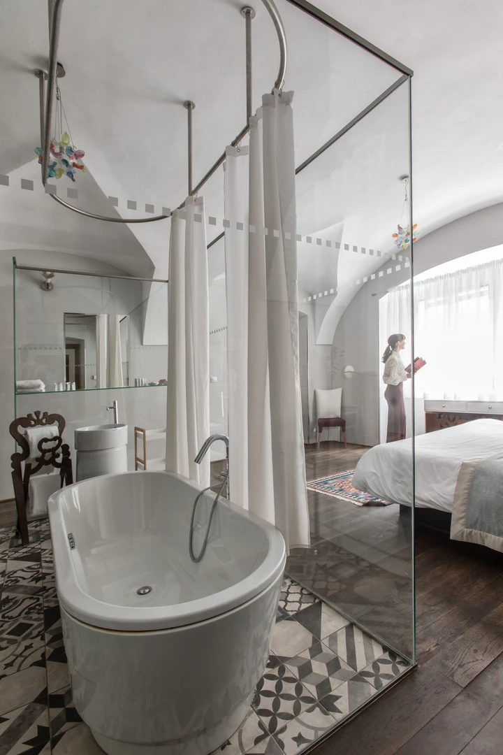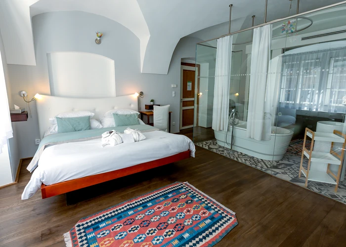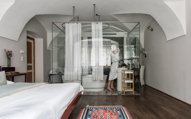 Each room is different, designed by famous Borek Sipek, with bathroom as the dominant element of room and decorated with special glass components. Rooms offer a queen size bed, free Wi-Fi, coffee and tea making facilities, Nespresso coffee machine, slippers, free exclusive bathroom cosmetics, safety deposit box, satellite TV and a minibar. Design hotel Neruda offers 2 Romantic Deluxe rooms with glass-walled bathroom which are perfect for a special romantic occasion.